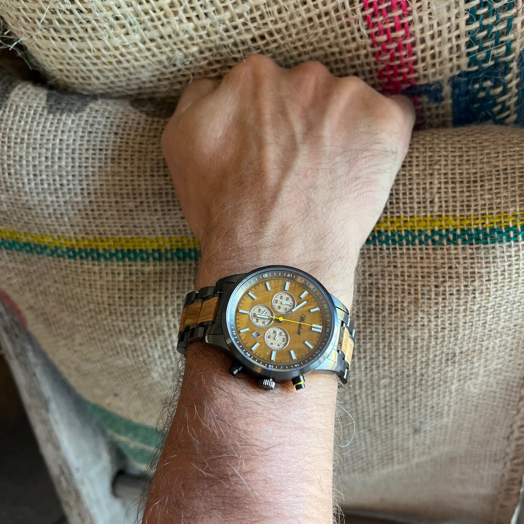 Der Courage Chronograph ist mehr als nur eine Uhr – sie ist ein Statement. Gefertigt aus echtem Barrique-Weinfass-Holz und Edelstahl, vereint dieses Modell kraftvolle Optik mit nachhaltiger Herkunft.